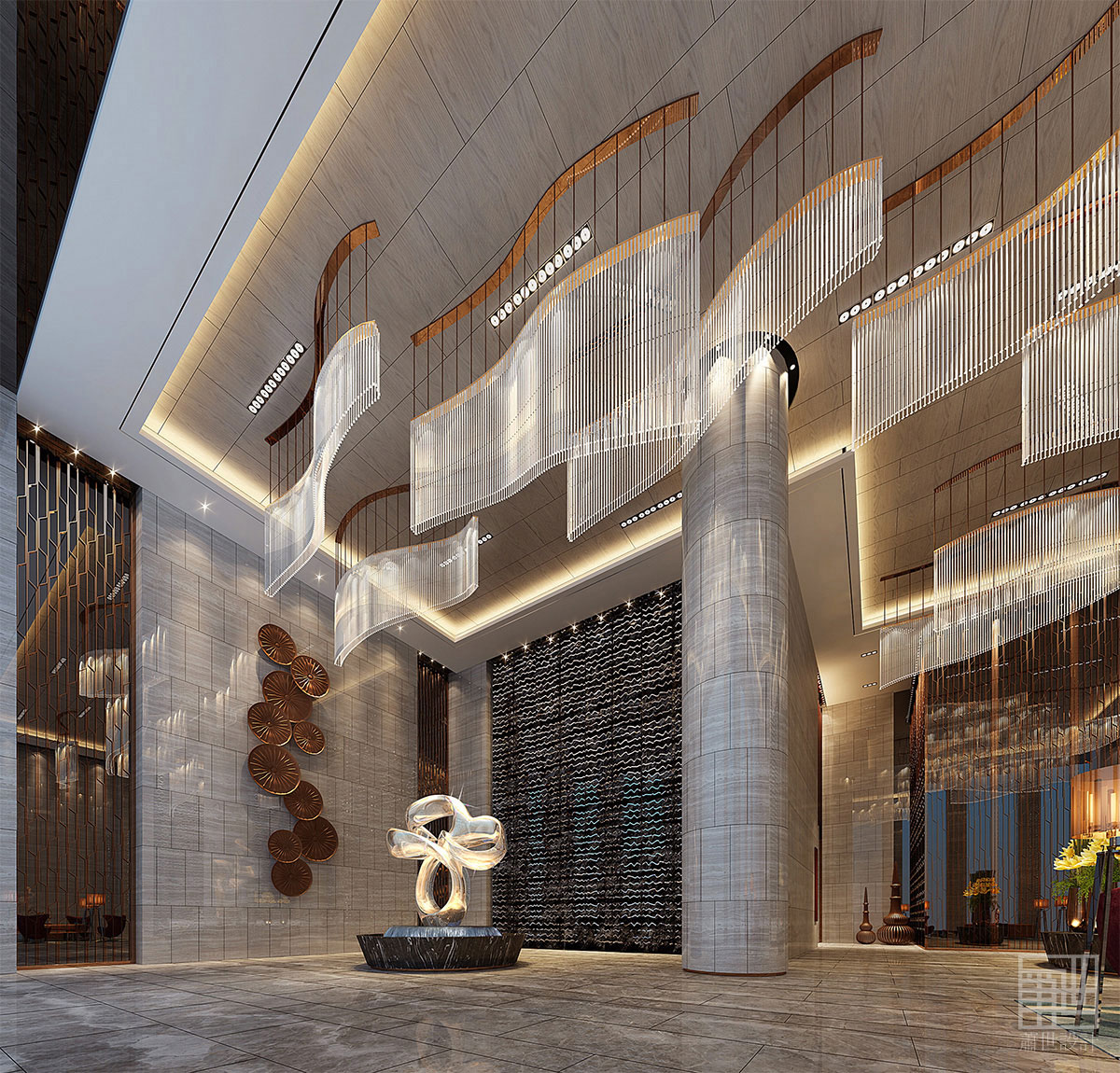 水清澈、通透、晶瑩,它是萬物的生命之源 。水能生財,湖能聚財,這一傳統風水理論,給本案帶來居多思想源泉。水可千變萬化,也可平如鏡面。設計師把波光粼粼、碧波漣漪、水波、水花等幾個水的常見形態用來作為設計元素的分形與提煉,把與水有關的形態語言巧妙的運用到空間設計上。設計師從一開始就注重了水的連貫性,首先從酒店主入口著手,采用圓形的噴泉作為過往車道的中軸景觀,再到大堂中心的水帶造型雕塑,使其作為酒店主要軸線。從外到內以水為引導方式來聚齊八方客。