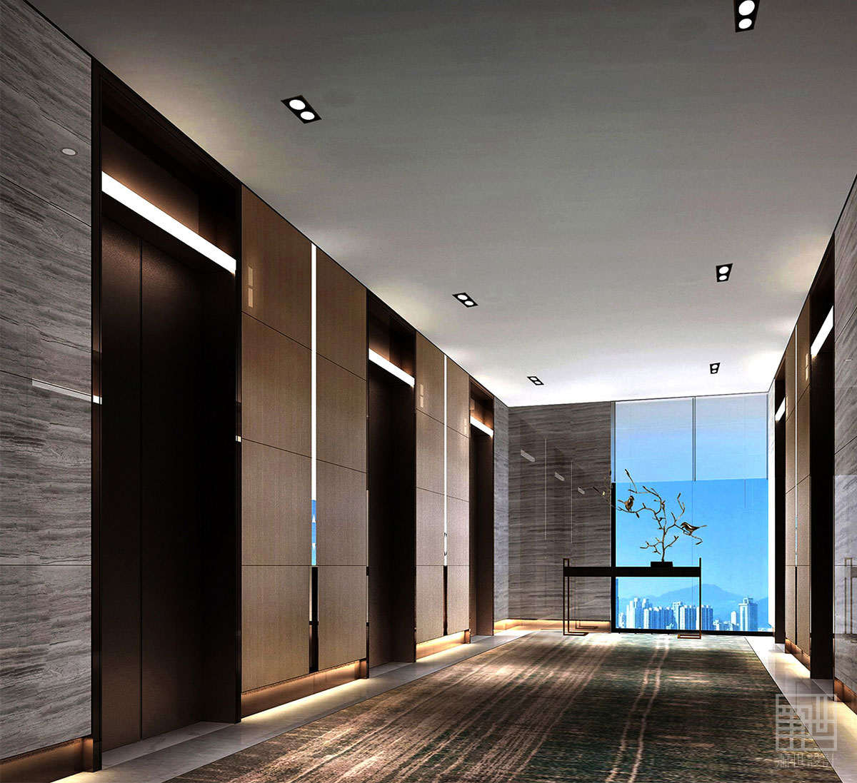 由于一層電梯間空間無自然采光的弊端,設計師巧妙的運用了以湖面景色的畫卷作為空間背景的延續,把銅制的飛鳥作為端景雕塑構建虛實變化來襯托空間的靈動。同時,客人在等候電梯時,也能將其帶入這片美麗的湖色畫卷之中。