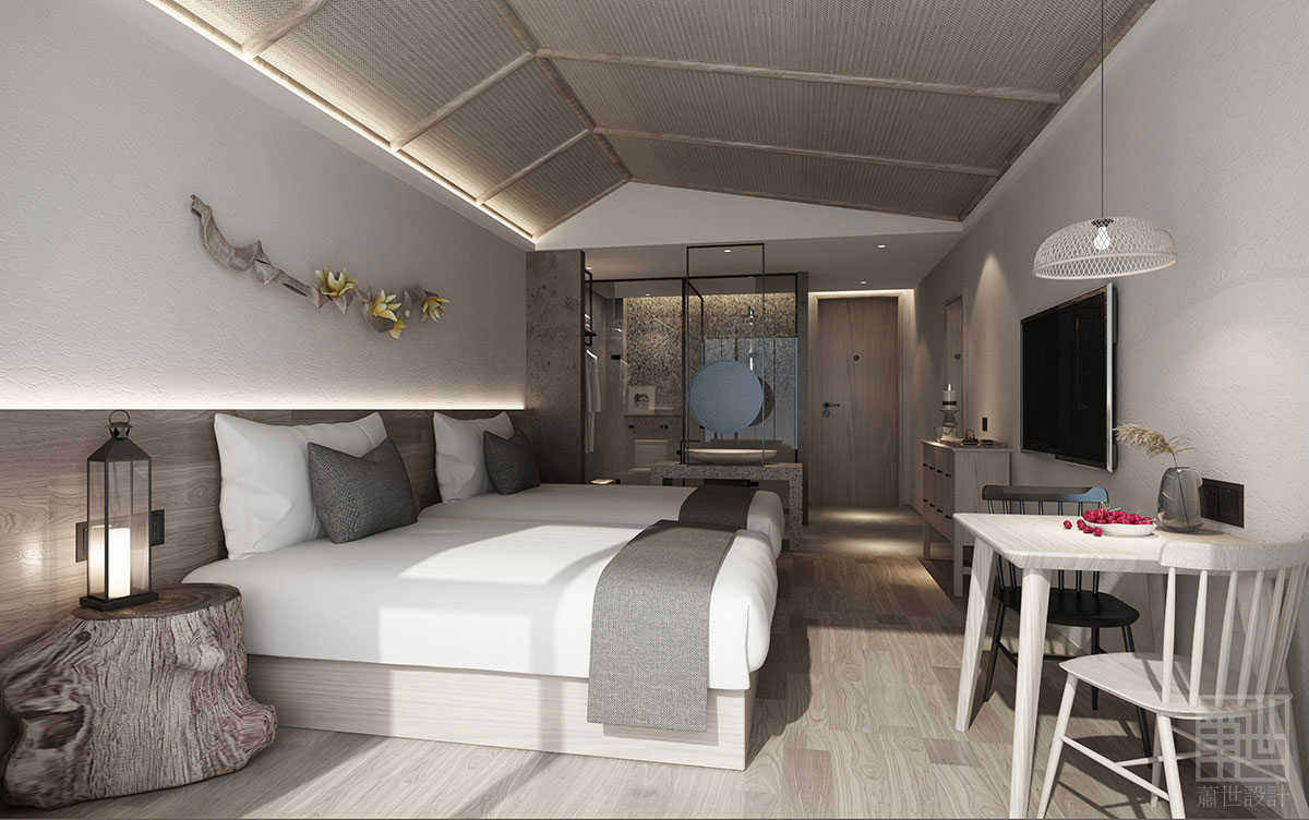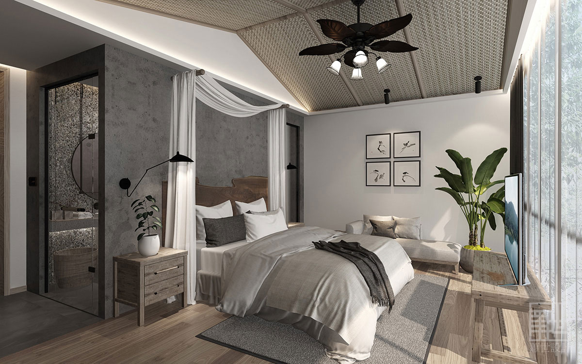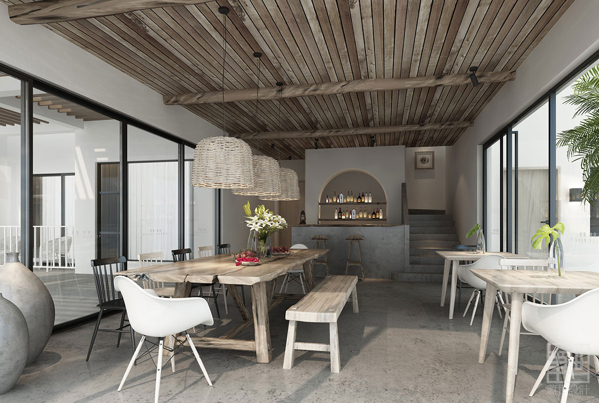 室內空間運用了當地傳統民居常用石料、木作、素水泥為主,石與木的自然紋理及質地,帶給現代人內心的情感仍然揮之不去。原石木就地取材,放棄精細加工,質樸的天然材料搭配精致的人工手作家具,在陽光或燈光的映襯下,粗礦中不乏精致和細膩。軟裝部分整個空間質樸典雅,灰色的沙發、麻料布藝、藤編、紗簾等...... 讓情境回歸変得如此的純粹,讓生活回歸它原有的樣子,讓每一位家人感受自然的樂趣,呼吸人間煙火的氣息。