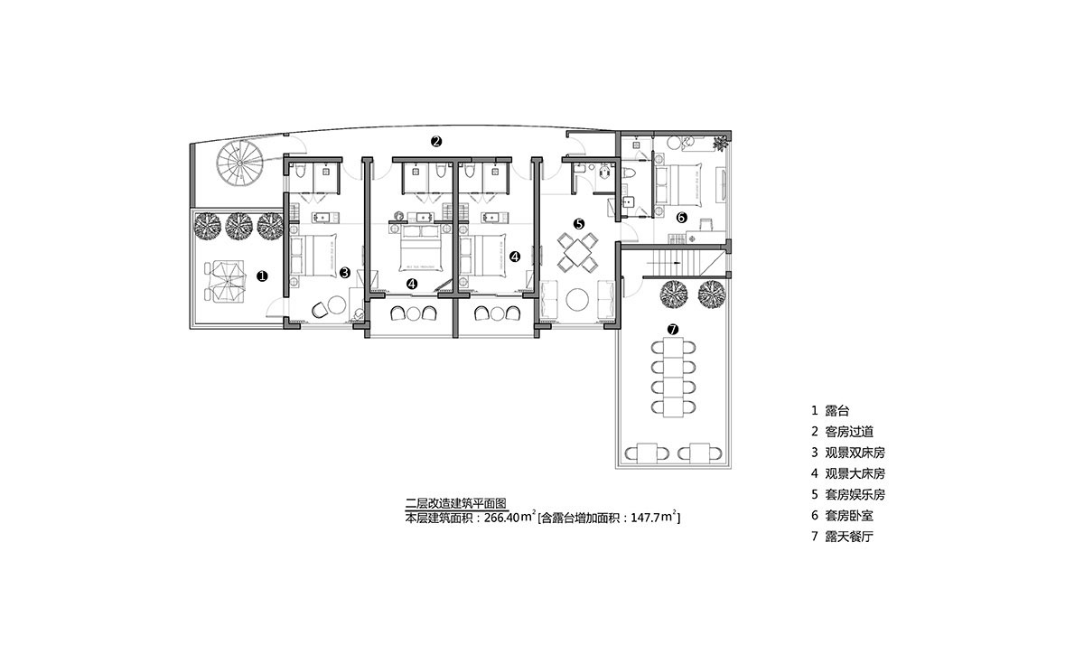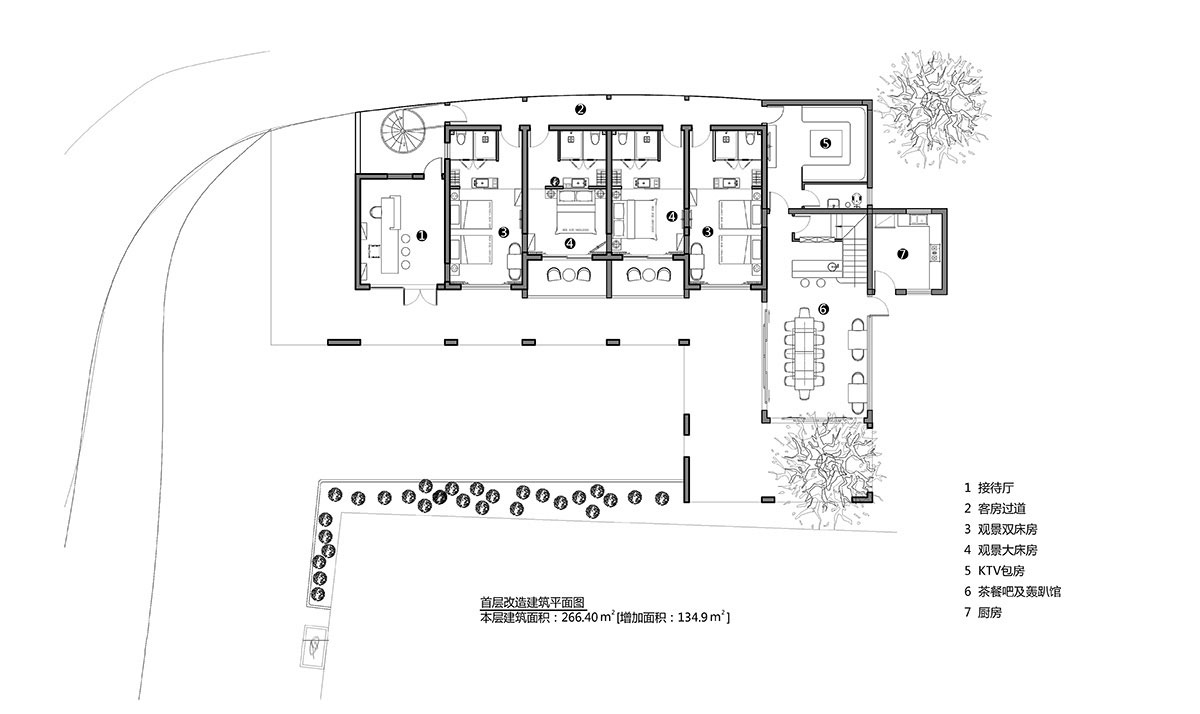 加建部分建筑增加配套用房空間,為了公共空間與客房私密空間提供過渡,設計師把客房過道設在屋后,在屋前外圍加建了陽光連廊,最大限度控制人流來往帶來的影響。在尊重自然環境的前提下,設計師把原有前坪的大樹保留,把大樹融入到陽光廊道,讓建筑與周邊環境更融合。