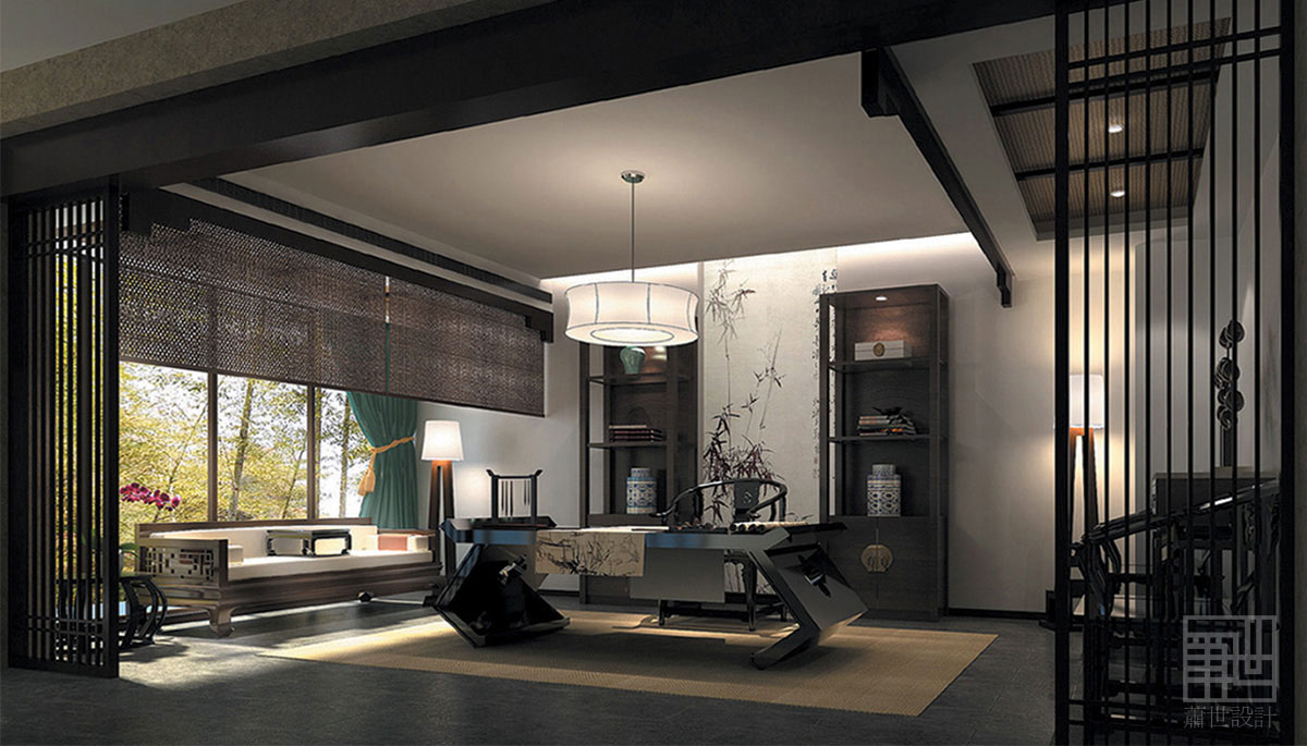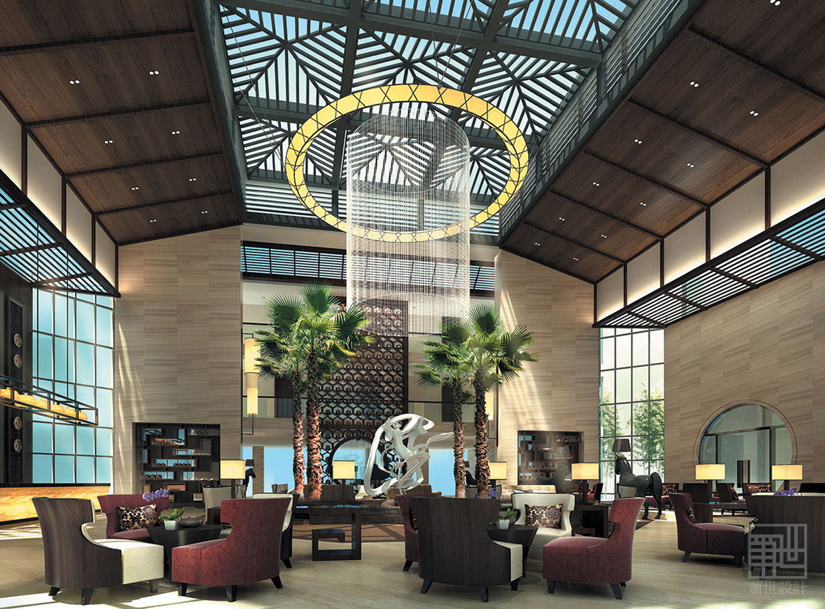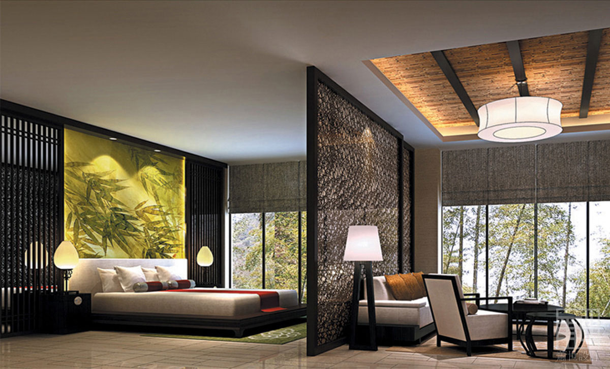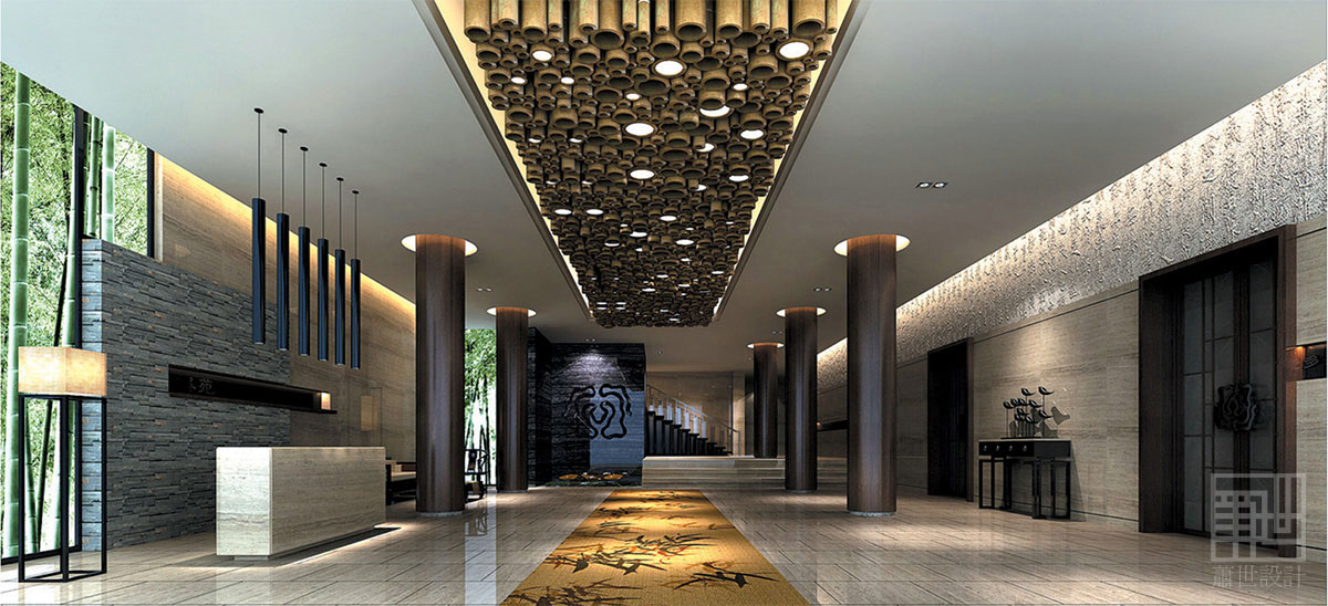 墨苑總建筑面積約4960平米,由大堂、會議室及客房等組成。根據(jù)業(yè)主要求,結(jié)合當?shù)氐赜蛱厣幕覀兇_立了以竹為主題,結(jié)合傳統(tǒng)書畫為設(shè)計的表現(xiàn)形式。著重傳達一種濃厚的文化氣息和休閑度假氣質(zhì),將竹的主題通過多種手法進行巧妙的演繹。大堂針對建筑原空間封閉的弱點,大膽將非承重墻局部敞開,與外部自然景觀形成對話。整個空間以《蘭亭序》為線索,通過天花的竹形成燈具和墻面的浮雕造型,著力體現(xiàn)《蘭亭序》中“崇山峻嶺,茂林修竹”、“群賢畢至,少長咸集”的意境。與建筑周邊環(huán)境(多山林修竹),使功能(會議)高度契合并使空間性格獨具一格。會議室根據(jù)面積大小和功能細分分別命名,大會議室為天朗,著重體現(xiàn)空間的開敞感和《蘭亭序》中“天朗氣清”的氛圍;中型會議室以“流觴”為主題,體現(xiàn)交流的樂趣;小會議室命名為“惠風”,主要針對空間封閉的弱點用較輕松的手法予人以休閑感。客房通過對原空間流線的重新梳理,套間普遍增大了衛(wèi)生間的使用面積,使客房品質(zhì)感得以極大提升。在設(shè)計語匯的使用上以新中式為主,在休閑舒適的前提下著力營造傳統(tǒng)書畫的藝術(shù)意境,主要構(gòu)想以“竹”為主題,貫穿各樓層,通過地毯、墻紙等軟裝傳遞“墨竹、朱竹、雪竹”等多種竹文化意象。讓旅客在舒適的環(huán)境中感受傳統(tǒng)文化的熏陶。